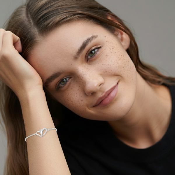 A prata leve toca a pele como um sussurro de carinho. Dois corações unidos e cravejados com zircônias delicadas simbolizam afetos que não se explicam, apenas se sentem. Seja um elo com alguém especial ou uma parte da sua própria jornada, essa joia traduz vínculos em forma e luz — com sofisticação e propósito.
