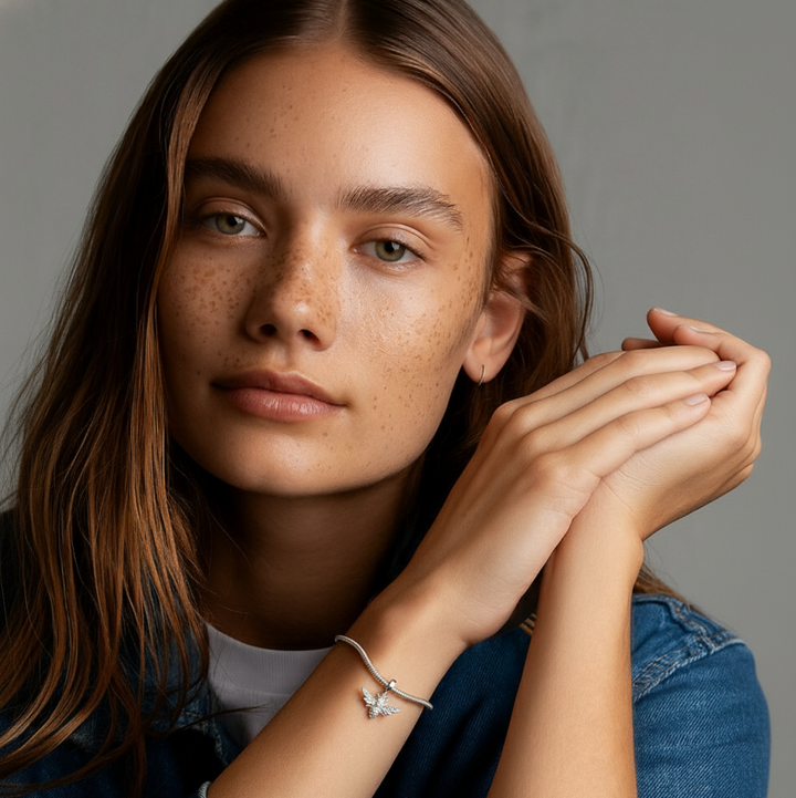 • A Base (Pulseira de Prata): O fio condutor elegante para seus marcos de conquista.
